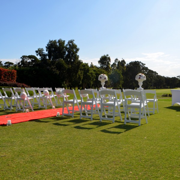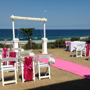 White Ceremony Arch with white Americano foldable chairs and Hot pink carpet aisle runner